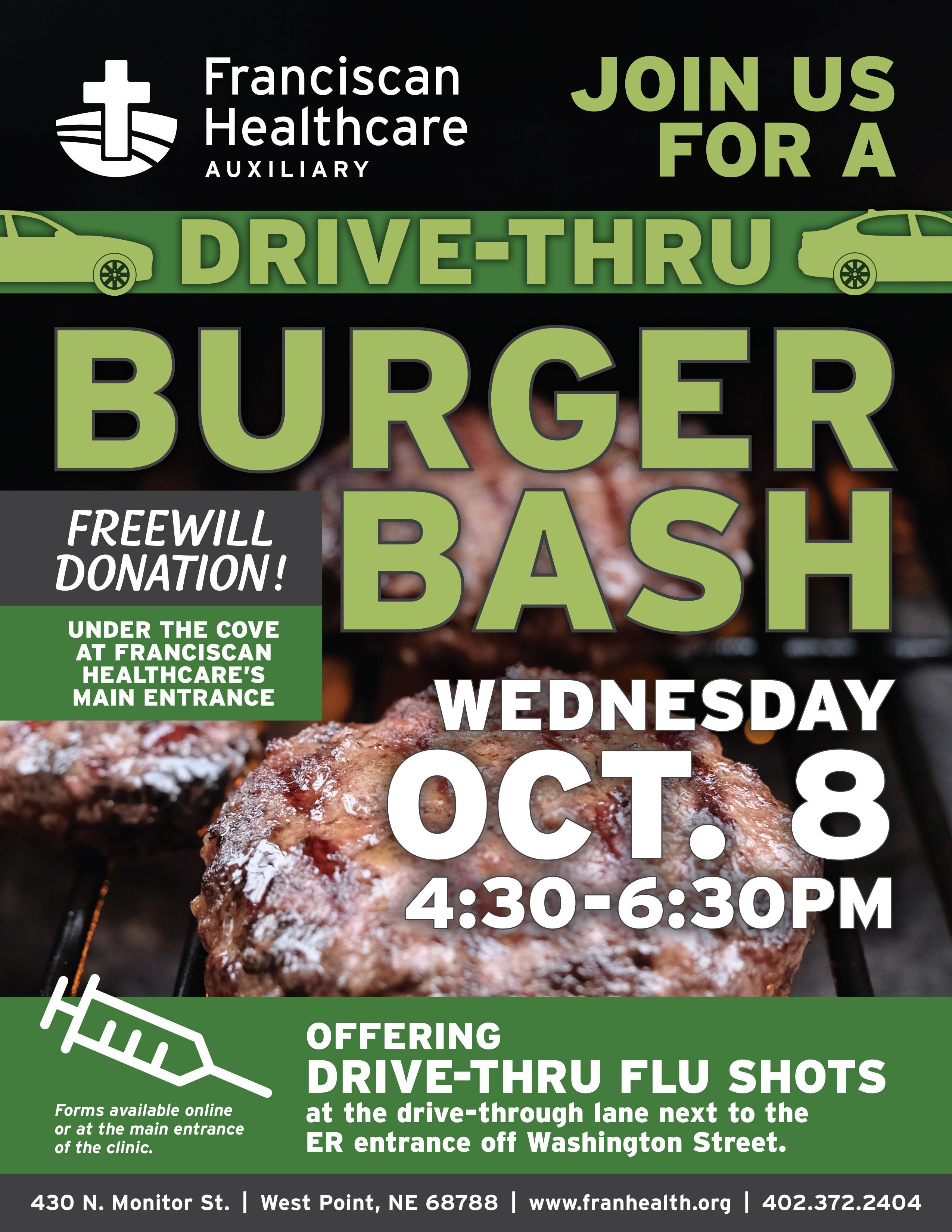 Join us for this year's Franciscan Healthcare Auxiliary BURGER BASH on Wednesday, October 8th, from 4:30 to 6:30 P.M., underneath the main entrance. This is the Auxiliary's main fundraiser and a great opportunity to donate to a great cause and pick up a quick, delicious meal for your entire family! Perfect for those working during harvest time or running to after-school activities.