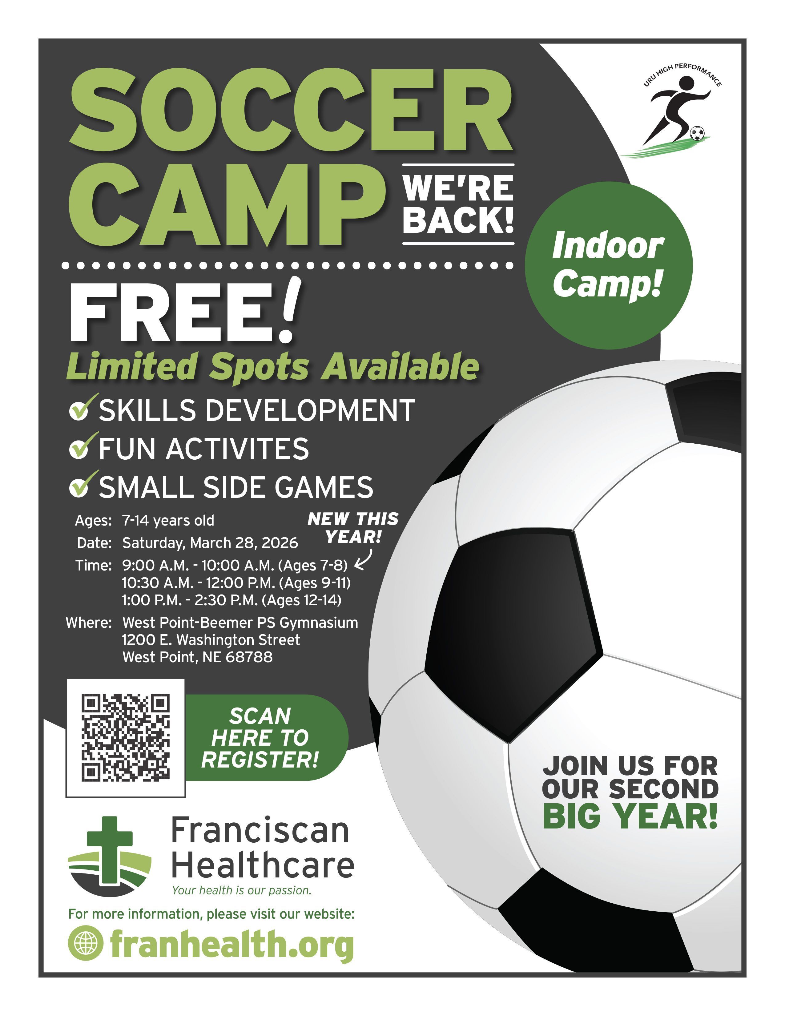 Join Franciscan Healthcare for their 2nd FREE Soccer Camp! This event takes place on March 28th at the West Point-Beemer Public School Gym. Please refer to the flyer or registration form, because time depends on age range. Click on the link to register and contact Carlos Saenz with any questions.